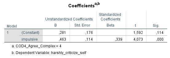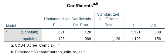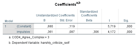 Man sieht, am Plot wie auch den Regressionen, dass der Test erfolgreich ist. In der Gruppe der wenig sozialen Menschen steigt die Selbstablehnung mit der Impulsivität an, aber nur in einem geringen Maß (ß = +0,13 oder +0,5 Standardabweichungen über die gesamte Skala, insignifikanter Effekt p > 0,05). Bei sehr sozialen Menschen steigt die Selbstablehnung viel stärker mit steigender Impulsivität an (ß = +0,34 oder +1,6 Standardabweichungen, signifikanter Effekt p < 0,001). Die Hypothese bleibt also nach diesem Härtetest plausibel.