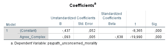 Je sozialer / empathischer eine Person, desto mehr Wert legt die Person auf die Moralität von Gedanken und Handlungen. Der Zusammenhang ist mit ß = -0,64 außerordentlich stark. Bei Menschen sozialer Natur ist also die Wahrscheinlichkeit deutlich höher, dass eine solche Diskrepanz im Laufe der Reflektion als problematisch eingestuft wird. Das passt gut ins Bild. Ein nächster Schritt wäre die Rolle der Reflektion für Selbstablehnung zu testen, jedoch habe ich bisher keine geeigneten Datensätze dafür gefunden und muss es entsprechend dabei belassen. Kritik an allem obigen ist natürlich herzlich willkommen.
