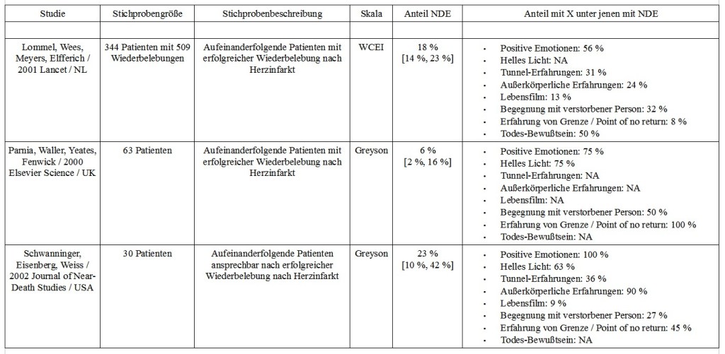 Beschränkt man die Suche auf Studien, welche a) eine validierte Skala zur Klassifizierung von NDE verwenden (WCEI, Greyson), b) nach 2000 veröffentlicht wurden, c) mehr als 20 Patienten untersuchen und d) ausschließlich Patienten mit tatsächlichem Herzstillstand betrachten, so lassen sich über Google Scholar die im Bild aufgeführten Studien finden. Die größte Studie analysiert 344 Patienten mit insgesamt 509 Wiederbelebungen, was schon einem beachtlichen Studienumfang mit hoher statistischer Aussagekraft entspricht. Daneben noch drei Studien mit einem kleineren, aber sehr ähnlichem Pool an Patienten und eine weitere Studie, welche spezifisch NDE bei geplantem Herzstillstand betrachtet.